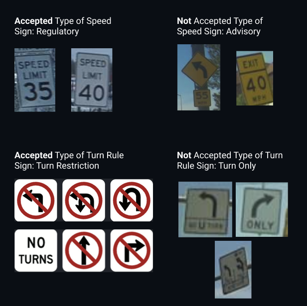 * In the United States: Only **turn restriction signs** are acceptable. Turn rules such as right/left turn only are **not** acceptable and should be marked as "No".