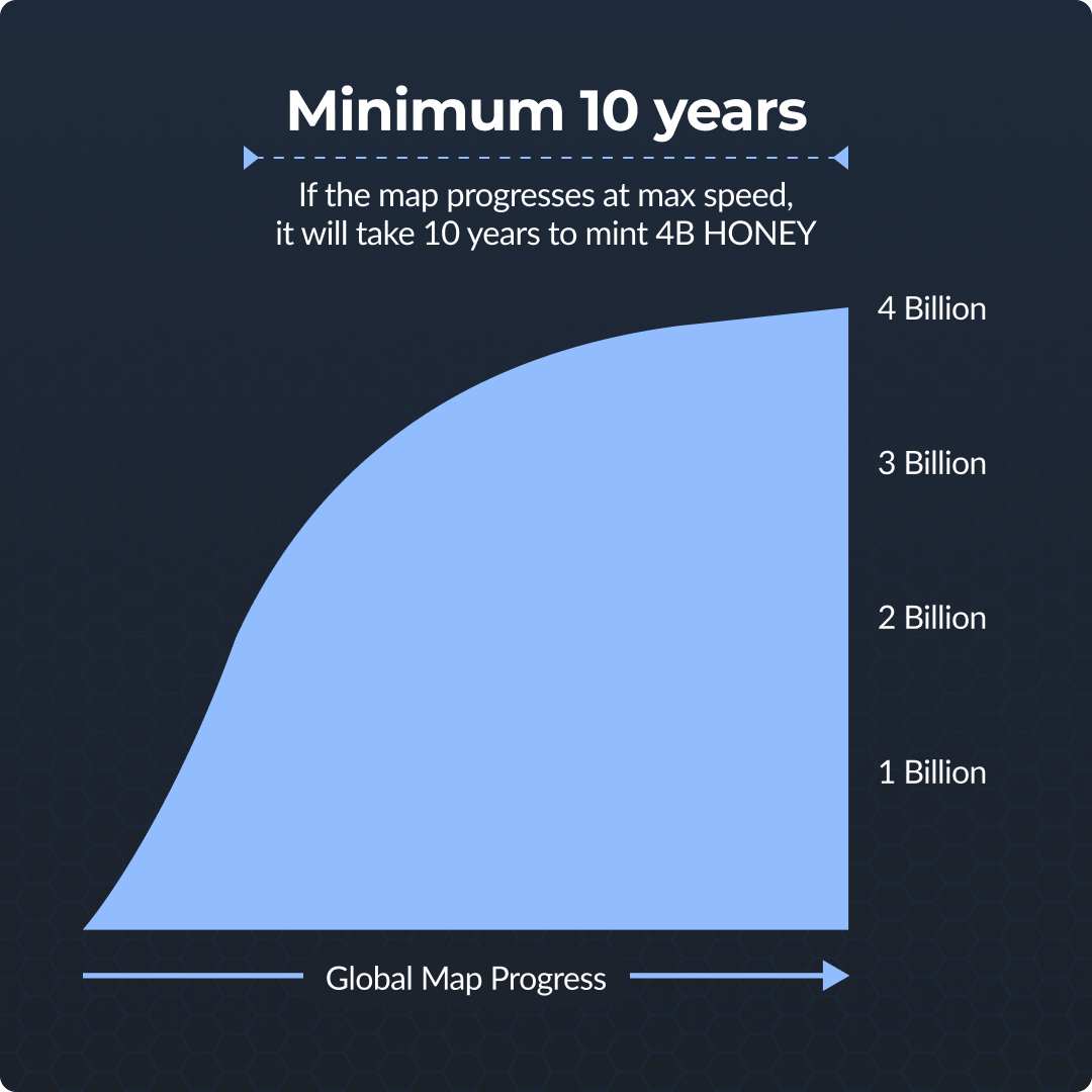 HONEY will be minted as progress is made towards 520 GMPUs. Since no more than 1 MPU can be earned in a given weekly reward period, the minimum amount of time it will take to mint the full 4 billion tokens is 520 weeks or 10 years (= 520 total MPU / 1.00 MPU per week).