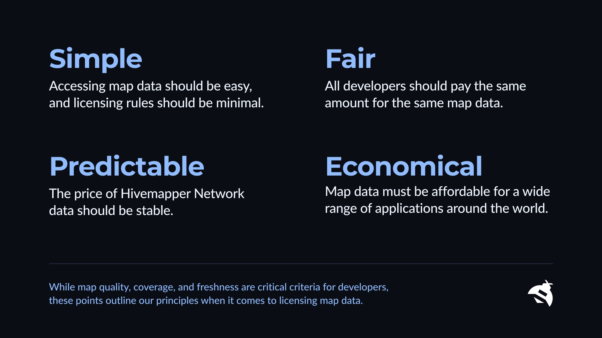 In conclusion, the fixed, non-negotiable wholesale price of Map Credits allows licensed developers to openly compete on a level playing field to serve map data customers. It gives developers an incentive to develop specialized value-added products – creating more ways for customers to gain value from Hivemapper Network data, and thus creating more demand for HONEY.